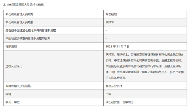 公告显示,耿帅军拥有理学硕士学位,具备基金从业资格,曾在国泰君安证券、中信证券(600030)和中金公司(601995)等多家机构任职,历任金融工程分析师、副总裁及执行总经理等职务。加入中金基金后,耿帅军先后担任量化指数部负责人、多资产部负责人兼基金经理,主导了公司多只量化及指数产品的管理工作。业内人士认为,从研究、量化到多资产投资的经历,使其成为公司在量化投资布局中的核心人选。