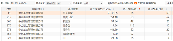 从公司基本面来看,中金基金今年三季度的整体规模仍保持稳健。Choice数据显示,截至9月30日,公司所有类型基金资产净值合计约2336.25亿元,行业排名第35位;其中非货币型基金规模854.40亿元,排名第53位。细分来看,债券型产品规模约441.69亿元,占非货币类资产的一半以上;股票型基金规模91.54亿元,混合型7.94亿元,ETF产品21.68亿元。