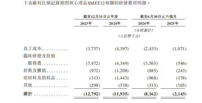 2024年,公司研发开支整体同比下降约30%。其中,核心产品SMET12在2025年上半年的研发费用为214万元人民币,相较于2024年同期的816万元,大幅下降了73.7%;另一产品DNV3在2024年的研发投入也同比下降53%,尽管在2025年上半年同比回升至1056万元,但其后续投入的持续性仍待观察。在生物制药这一典型的长周期、高投入行业背景下,研发费用仅为千万元级别,时迈药业短期内难以走出亏损困境。