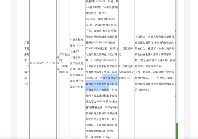 2024年8月21日,该公司商品中心还向好想来加盟店下发过不合格商品的下架通知。11月的处罚通知上也显示彭德健在好想来体系中话语权不小。