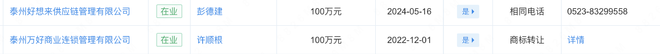 虽未披露,但泰州好想来明显和万辰集团拥有千丝万缕的关系。《财中社》梳理发现,万辰集团2024年报中,公司旗下全资子公司泰州好想来供应链管理有限公司(下称“好想来供应链”)、泰州万好商业连锁管理有限公司,企业电话和泰州好想来的电话相同。