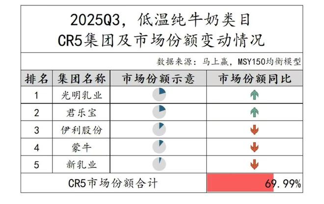 悦鲜活单品牌助力君乐宝拿下了低温奶市场份额。马上赢数据显示,君乐宝在2025年前三季度市场份额同比增长,在低温奶行业市占率排名第二,仅次于老大哥光明乳业,而新乳业的市场份额则居行业第五。
