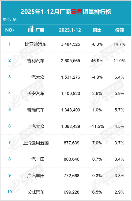 据中国汽车流通协会乘用车市场信息联席分会最新销量数据统计,2025年12月份国内狭义乘用车市场零售销量达226.1万辆,同比下降14.0%,环比增长1.6%;1-12月份累计销量2374.4万辆,同比增长3.8%。