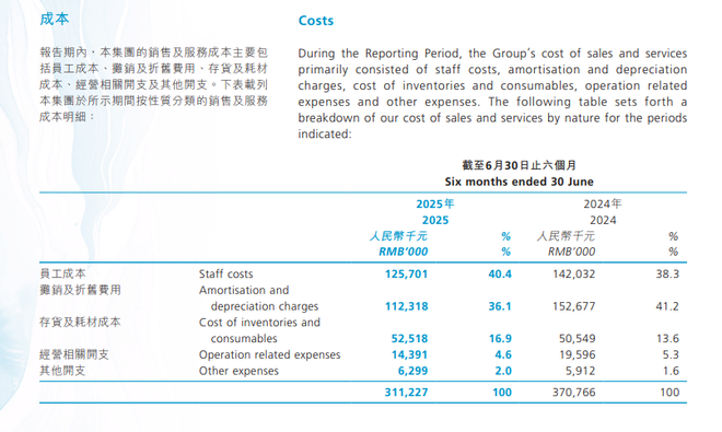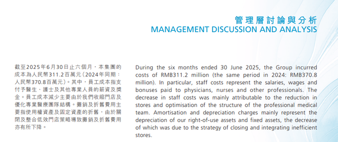 同样是在关店助力下,其销售及服务成本由上年同期的3.71亿元,降至3.11亿元。2025年中报对此明确解释称,其中的员工成本减少主要是由于收缩门店及优化专业医疗团队结构;摊销及折旧费用主要指使用权资产及固定资产的折旧,由于关闭及整合低效门店策略导致摊销及折旧费用亦有所下降。