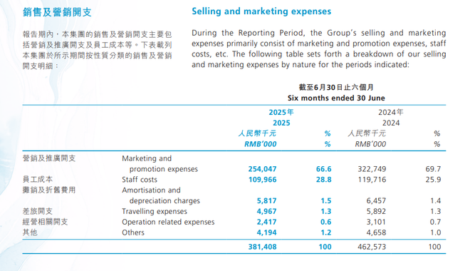 对于销售费用下降,公司称原因在于优化资源分配和实施精细化营销策略。公司销售费用主要包括营销及推广开支及员工成本等,其中降幅最大的是营销及推广开支,由上年同期的3.23亿元降至2.54亿元。