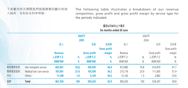 雍禾医疗是一家主要从事植发业务的中国公司,主营业务是通过医疗机构提供一站式毛发医疗服务,包括植发医疗、医疗养护、常规养护和其他配套服务。该公司被视为行业龙头,但其业绩却走出“逆周期”曲线,2025年上半年营业收入同比下降4.29%,与行业高增长形成鲜明对比。