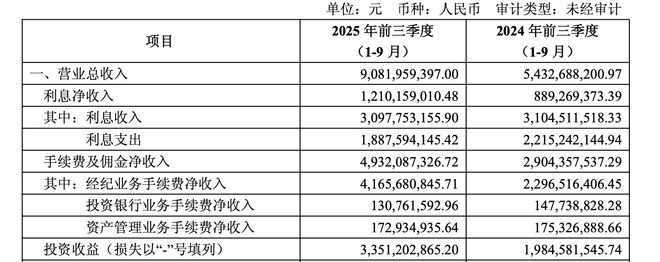作为一家净资产突破500亿元的中型券商,方正证券在2025年前三季度实现了利润高增,营业收入为90.82亿元,同比增长67.17%;归母净利润为37.99亿元,同比增长93.31%。但这一增长主要由财富管理与投资交易驱动,投行业务相比之下显得乏力:前三季度,公司投行业务手续费净收入约为1.31亿元,同比下滑11.49%;经纪业务手续费净收入则高达41.66亿元,投资收益高达33.51亿元,投行收入占比非常小。