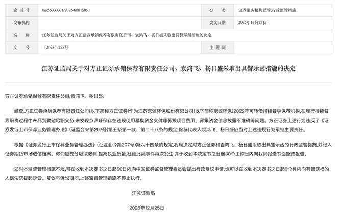 12月25日,江苏证监局披露了一则行政监管措施决定书,指出方正证券(601901)承销保荐有限责任公司(下称“方正承销保荐”)作为京源环保(688096)2022年可转债项目的持续督导保荐机构,在持续督导中未勤勉尽职,未发现京源环保存在违规使用募集资金支付非募投项目费用、募集资金信息披露不准确等问题,两名保代袁鸿飞、杨日盛对相关违规承担主要责任,监管对公司和两名保代采取出具警示函并记入诚信档案的措施,要求在30个工作日内报送整改报告。